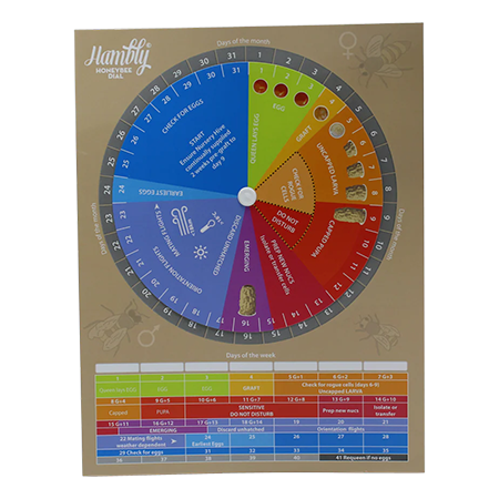 The Hambly Queen Dial is a queen rearing scheduling tool that helps beekeepers track queen development from egg through hatching and plan critical tasks at the right time. Simply turn the dial to align with the day of the month, and it provides an easy, at-a-glance timeline for what stage the queen is in and what actions you should take next.