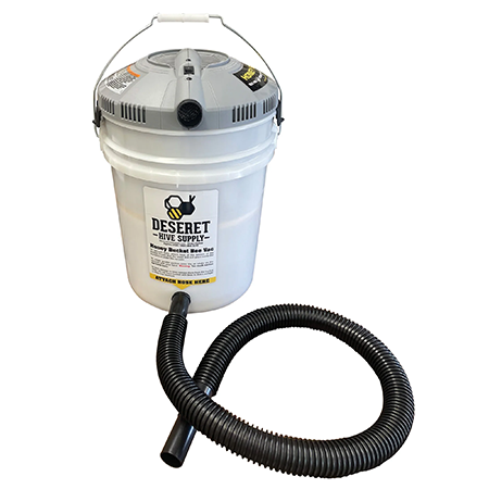 The Honey bucket bee vacuum has a 1.75 HP, 110 volt bucket head motor. (extension cord and power source required.) The 5 gallon container has a wooden disk with a wire screen and two handles. The wooden disk is inserted into the bucket and place snugly about 1/2 way down. There is a hole at the bottom edge of the bucket for the suction hose to be placed. When the vacuum is turned on it will gently suck bees up into the bottom of the bucket and they are held below the wooden disk. We recommend emptying the bucket periodically by removing the head and the disk and dumping the bees into a separate box or container to store the bees until you can place them in a hive. If more suction is need you can cover the inlet hole on the vacuum head which will give you more suction on the vacuum hose. Do not store bee’s in the bucket for long periods of time or in direct sunlight. This may cause over heating of the bees.