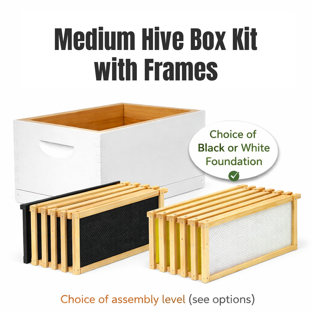 Medium boxes are most commonly used for honey production, making them easier to lift and manage than deep boxes. Frames in this kit are available with black or white plastic foundation, depending on your preference.